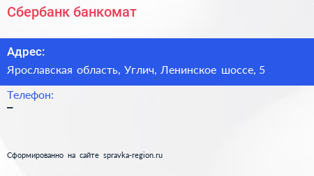 Сбербанк, банкомат по адресу Ярославская область, Углич, Ленинское шоссе, 5 в дальнейшем Организация, размещена в следующих категориях: