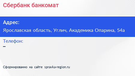 Сбербанк, банкомат по адресу Ярославская область, Углич, Академика Опарина, 54а в дальнейшем Организация, размещена в следующих категориях: