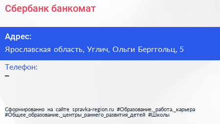 Сбербанк, банкомат по адресу Ярославская область, Углич, Ольги Берггольц, 5 в дальнейшем Организация, размещена в следующих категориях: