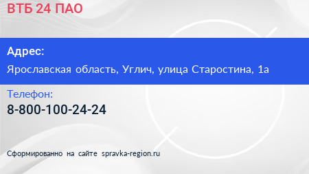 ВТБ 24, ПАО по адресу Ярославская область, Углич, улица Старостина, 1а в дальнейшем Организация, размещена в следующих категориях: