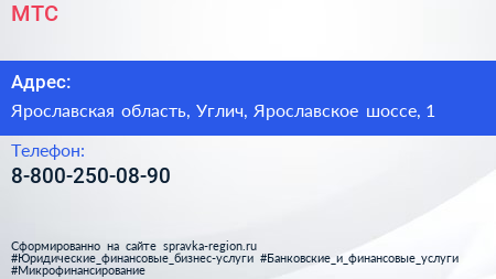МТС по адресу Ярославская область, Углич, Ярославское шоссе, 1 в дальнейшем Организация, размещена в следующих категориях: