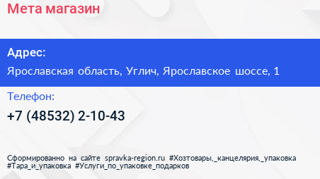 Мета, магазин по адресу Ярославская область, Углич, Ярославское шоссе, 1 в дальнейшем Организация, размещена в следующих категориях: