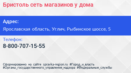Бристоль, сеть магазинов у дома по адресу Ярославская область, Углич, Рыбинское шоссе, 5 в дальнейшем Организация, размещена в следующих категориях: