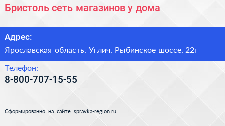 Бристоль, сеть магазинов у дома по адресу Ярославская область, Углич, Рыбинское шоссе, 22г в дальнейшем Организация, размещена в следующих категориях: