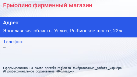 Ермолино, фирменный магазин по адресу Ярославская область, Углич, Рыбинское шоссе, 22ж в дальнейшем Организация, размещена в следующих категориях: