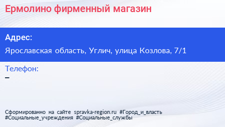Ермолино, фирменный магазин по адресу Ярославская область, Углич, улица Козлова, 7/1 в дальнейшем Организация, размещена в следующих категориях: