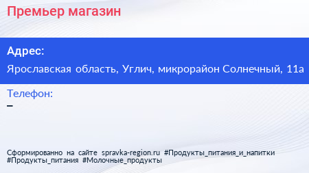 Премьер, магазин по адресу Ярославская область, Углич, микрорайон Солнечный, 11а в дальнейшем Организация, размещена в следующих категориях: