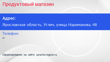 Продуктовый магазин по адресу Ярославская область, Углич, улица Нариманова, 48 в дальнейшем Организация, размещена в следующих категориях: