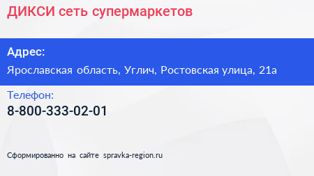 ДИКСИ, сеть супермаркетов по адресу Ярославская область, Углич, Ростовская улица, 21а в дальнейшем Организация, размещена в следующих категориях: