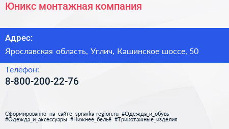 Юникс, монтажная компания по адресу Ярославская область, Углич, Кашинское шоссе, 50 в дальнейшем Организация, размещена в следующих категориях:
