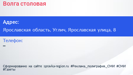 Волга, столовая по адресу Ярославская область, Углич, Ярославская улица, 8 в дальнейшем Организация, размещена в следующих категориях: