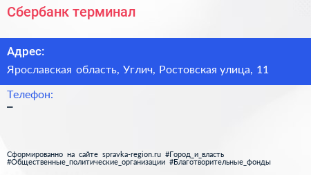 Сбербанк, терминал по адресу Ярославская область, Углич, Ростовская улица, 11 в дальнейшем Организация, размещена в следующих категориях: