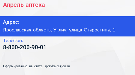 Апрель, аптека по адресу Ярославская область, Углич, улица Старостина, 1 в дальнейшем Организация, размещена в следующих категориях: