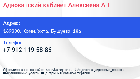 Адвокатский кабинет Алексеева А.Е. по адресу 169330, Коми, Ухта, Бушуева, 18а в дальнейшем Организация, размещена в следующих категориях: