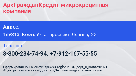 АрхГражданКредит, микрокредитная компания по адресу 169313, Коми, Ухта, проспект Ленина, 22 в дальнейшем Организация, размещена в следующих категориях: