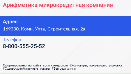 Арифметика, микрокредитная компания по адресу 169330, Коми, Ухта, Строительная, 2а в дальнейшем Организация, размещена в следующих категориях: