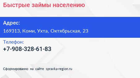 Быстрые займы населению по адресу 169313, Коми, Ухта, Октябрьская, 23 в дальнейшем Организация, размещена в следующих категориях: