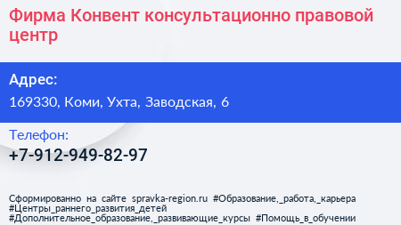 Фирма Конвент, консультационно-правовой центр по адресу 169330, Коми, Ухта, Заводская, 6 в дальнейшем Организация, размещена в следующих категориях: