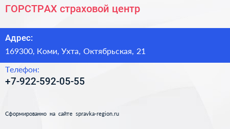 ГОРСТРАХ, страховой центр по адресу 169300, Коми, Ухта, Октябрьская, 21 в дальнейшем Организация, размещена в следующих категориях: