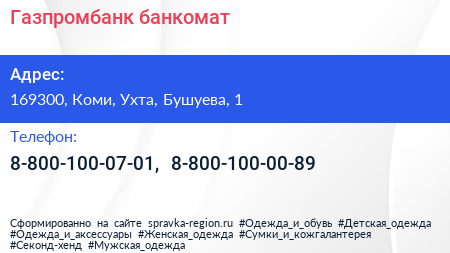 Газпромбанк, банкомат по адресу 169300, Коми, Ухта, Бушуева, 1 в дальнейшем Организация, размещена в следующих категориях:
