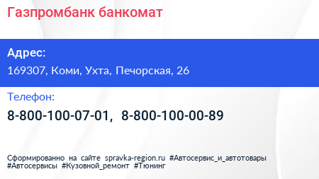Газпромбанк, банкомат по адресу 169307, Коми, Ухта, Печорская, 26 в дальнейшем Организация, размещена в следующих категориях: