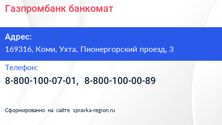 Газпромбанк, банкомат по адресу 169316, Коми, Ухта, Пионергорский проезд, 3 в дальнейшем Организация, размещена в следующих категориях: