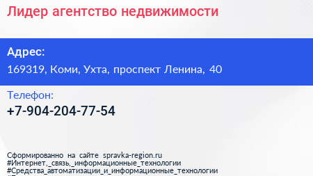 Лидер, агентство недвижимости по адресу 169319, Коми, Ухта, проспект Ленина, 40 в дальнейшем Организация, размещена в следующих категориях: