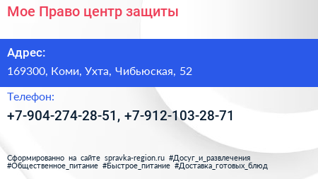 Мое Право, центр защиты по адресу 169300, Коми, Ухта, Чибьюская, 52 в дальнейшем Организация, размещена в следующих категориях: