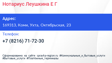 Нотариус Леушкина Е.Г. по адресу 169313, Коми, Ухта, Октябрьская, 23 в дальнейшем Организация, размещена в следующих категориях: