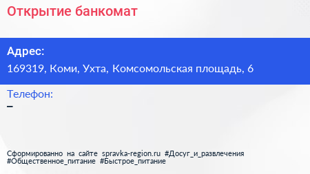 Открытие, банкомат по адресу 169319, Коми, Ухта, Комсомольская площадь, 6 в дальнейшем Организация, размещена в следующих категориях: