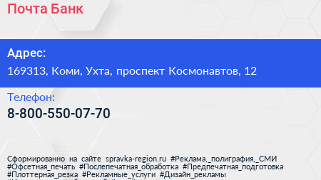 Почта Банк по адресу 169313, Коми, Ухта, проспект Космонавтов, 12 в дальнейшем Организация, размещена в следующих категориях: