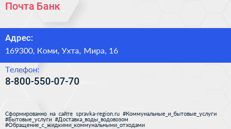 Почта Банк по адресу 169300, Коми, Ухта, Мира, 16 в дальнейшем Организация, размещена в следующих категориях: