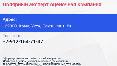Полярный эксперт, оценочная компания по адресу 169300, Коми, Ухта, Семяшкина, 8а в дальнейшем Организация, размещена в следующих категориях: