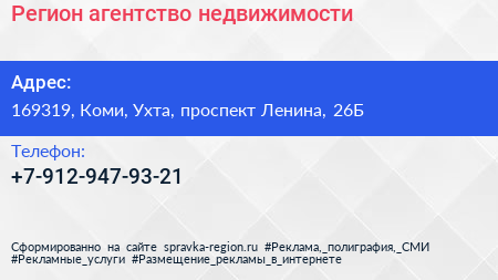 Регион, агентство недвижимости по адресу 169319, Коми, Ухта, проспект Ленина, 26Б в дальнейшем Организация, размещена в следующих категориях:
