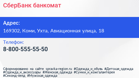 СберБанк, банкомат по адресу 169302, Коми, Ухта, Авиационная улица, 18 в дальнейшем Организация, размещена в следующих категориях: