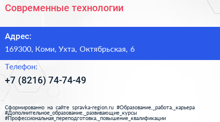 Современные технологии по адресу 169300, Коми, Ухта, Октябрьская, 6 в дальнейшем Организация, размещена в следующих категориях: