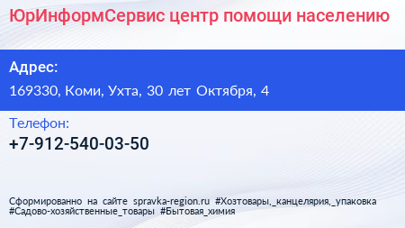 ЮрИнформСервис, центр помощи населению по адресу 169330, Коми, Ухта, 30 лет Октября, 4 в дальнейшем Организация, размещена в следующих категориях: