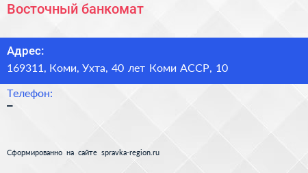 Восточный, банкомат по адресу 169311, Коми, Ухта, 40 лет Коми АССР, 10 в дальнейшем Организация, размещена в следующих категориях: