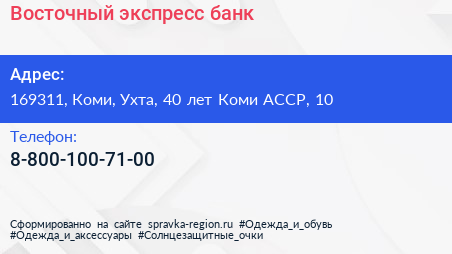 Восточный экспресс банк по адресу 169311, Коми, Ухта, 40 лет Коми АССР, 10 в дальнейшем Организация, размещена в следующих категориях: