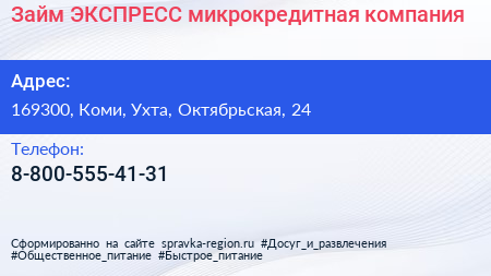 Займ ЭКСПРЕСС, микрокредитная компания по адресу 169300, Коми, Ухта, Октябрьская, 24 в дальнейшем Организация, размещена в следующих категориях: