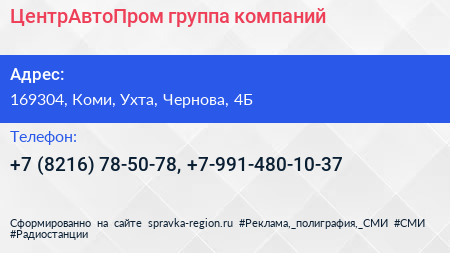ЦентрАвтоПром, группа компаний по адресу 169304, Коми, Ухта, Чернова, 4Б в дальнейшем Организация, размещена в следующих категориях: