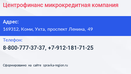 Центрофинанс, микрокредитная компания по адресу 169312, Коми, Ухта, проспект Ленина, 49 в дальнейшем Организация, размещена в следующих категориях: