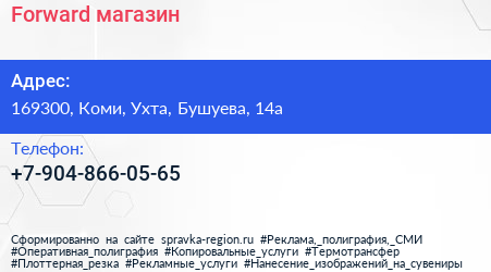 Forward, магазин по адресу 169300, Коми, Ухта, Бушуева, 14а в дальнейшем Организация, размещена в следующих категориях: