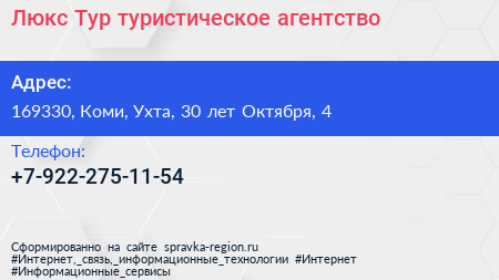Люкс Тур, туристическое агентство по адресу 169330, Коми, Ухта, 30 лет Октября, 4 в дальнейшем Организация, размещена в следующих категориях:
