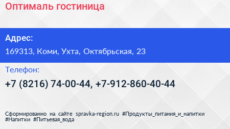 Оптималь, гостиница по адресу 169313, Коми, Ухта, Октябрьская, 23 в дальнейшем Организация, размещена в следующих категориях: