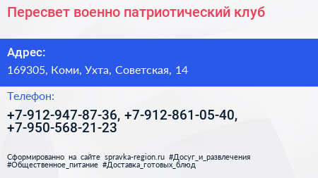 Пересвет, военно-патриотический клуб по адресу 169305, Коми, Ухта, Советская, 14 в дальнейшем Организация, размещена в следующих категориях:
