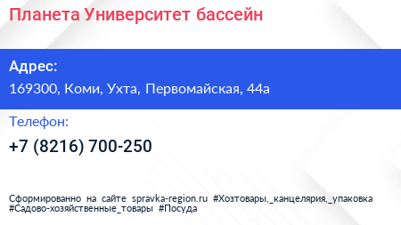 Планета-Университет, бассейн по адресу 169300, Коми, Ухта, Первомайская, 44а в дальнейшем Организация, размещена в следующих категориях: