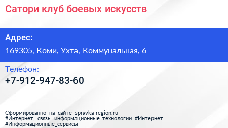 Сатори, клуб боевых искусств по адресу 169305, Коми, Ухта, Коммунальная, 6 в дальнейшем Организация, размещена в следующих категориях: