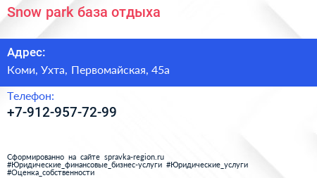 Snow park, база отдыха по адресу Коми, Ухта, Первомайская, 45а в дальнейшем Организация, размещена в следующих категориях: