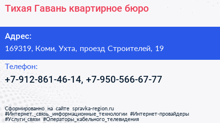 Тихая Гавань, квартирное бюро по адресу 169319, Коми, Ухта, проезд Строителей, 19 в дальнейшем Организация, размещена в следующих категориях:
